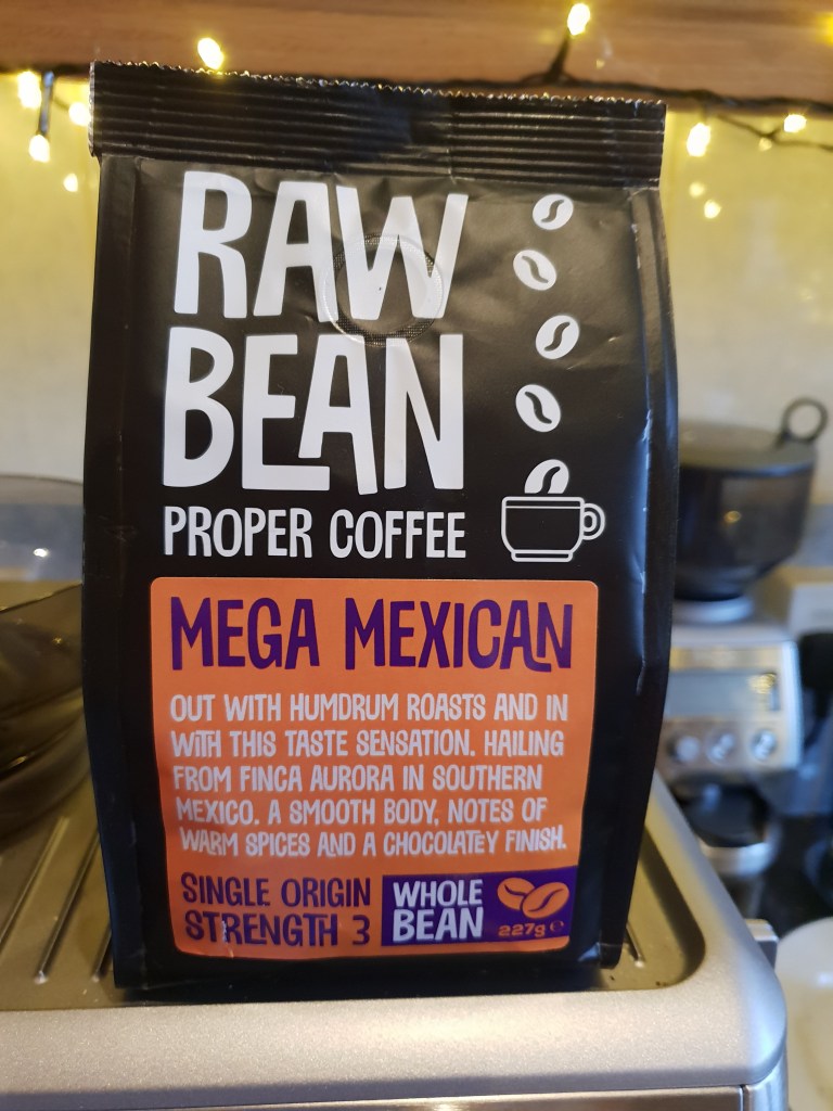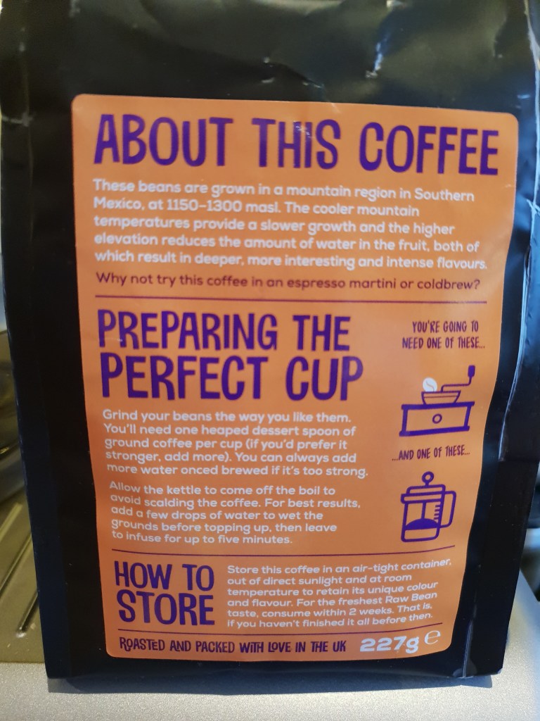 At the moment there’s only one of their coffees available in my local Sainsburys so let’s take a look at Raw Bean’s “Mega Mexican” single origin coffee.
