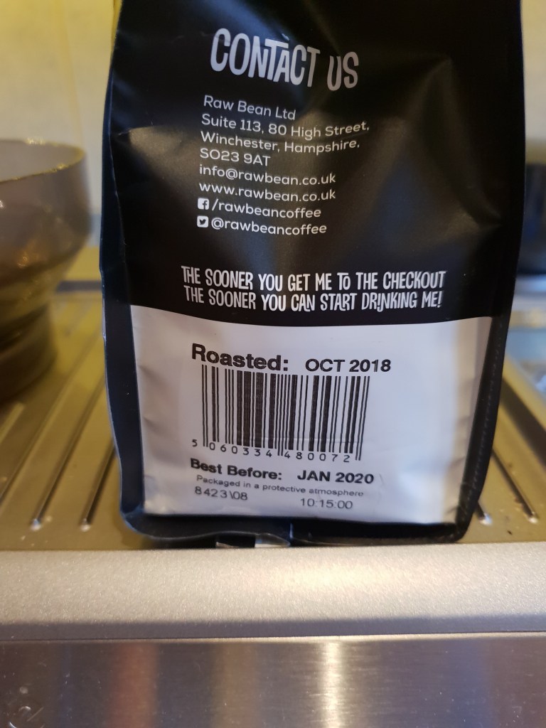 First up – Packaging props!  My beans arrived in a flat packed cardboard sleeve that fit easily through the letterbox so no faffing around with having to be in, or go to the sorting office afterwards.  The bag is resealable, with all the information you might want clear on the front.  Big thumbs up on this, my penchant for resealable bags is likely well known by now.